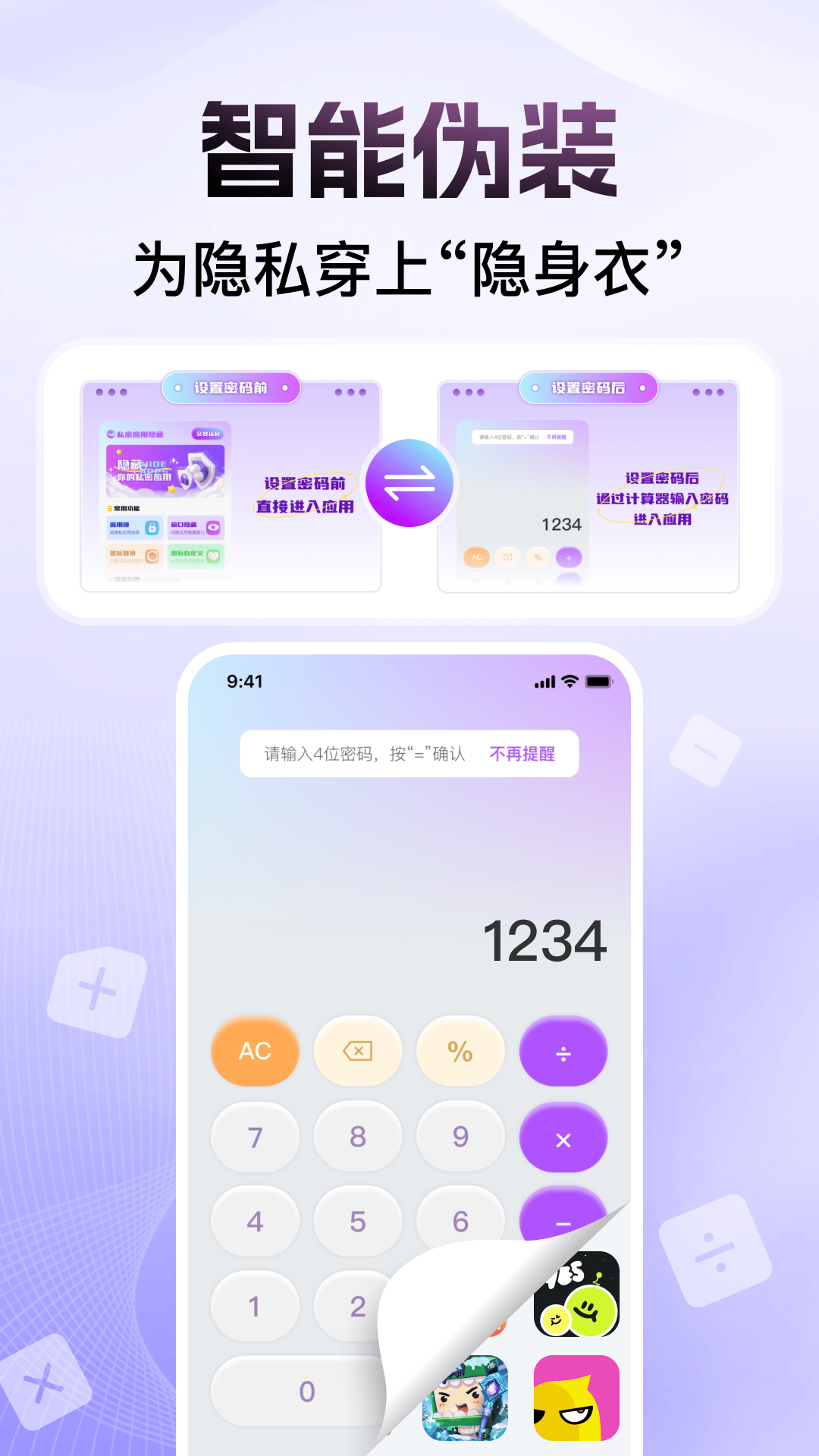 2、智能伪装黑科技加持,可伪装成计算器、拨号盘等常用工具,正常功能可用,输入密码才解锁真实隐私界面。