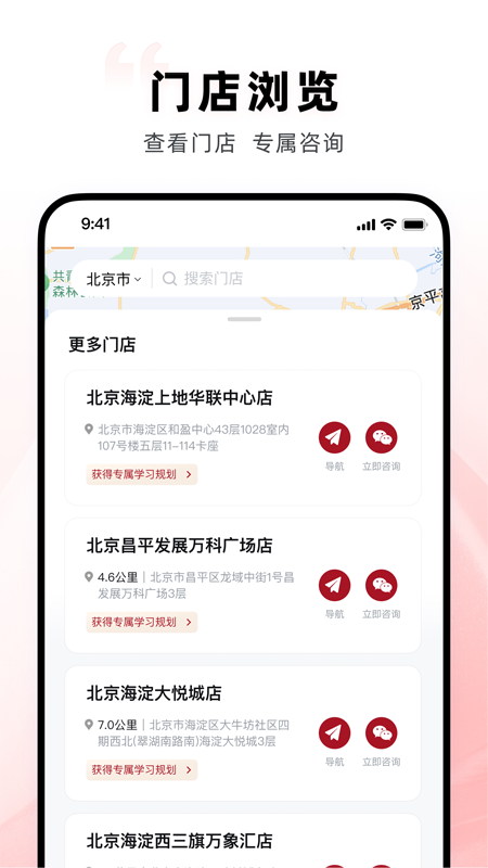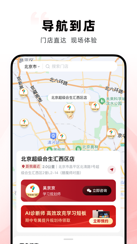 3、通过内置的地图导航功能,无论您身处何地,都能轻松找到最近的学而思门店,直达目的地。