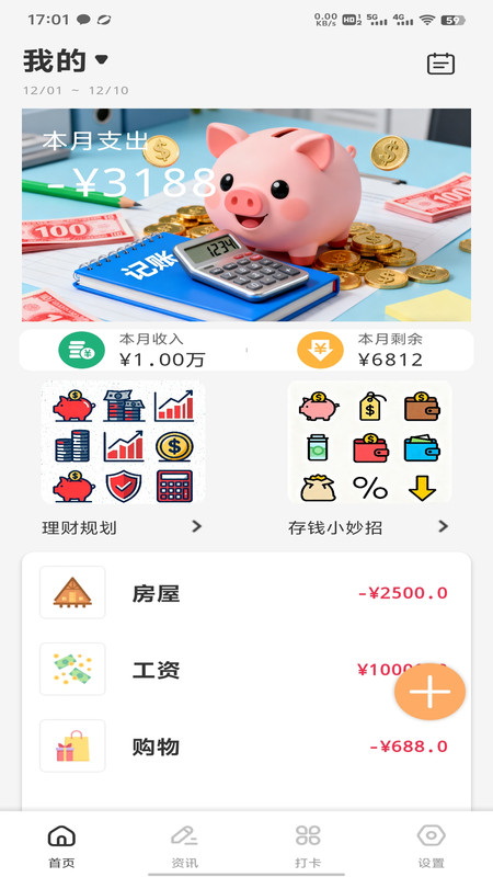 1、同步统计本月支出与收入明细,进行合理的理财规划。