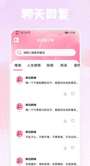 秓聊app是一款汇集了大量的聊天话术应用,不少的情侣们都会来这搜索想要的话术,不同阶段的情侣可以使用的话术也是不同的,任你一键搜索,一键在线复制使用,好的聊天话术是可以让你们的情感得到升温,你也可以随时感受到聊天的魅力,如果你想在话术上添加属于你的元素也是可以的,任你一键在线进行重新编辑使用。