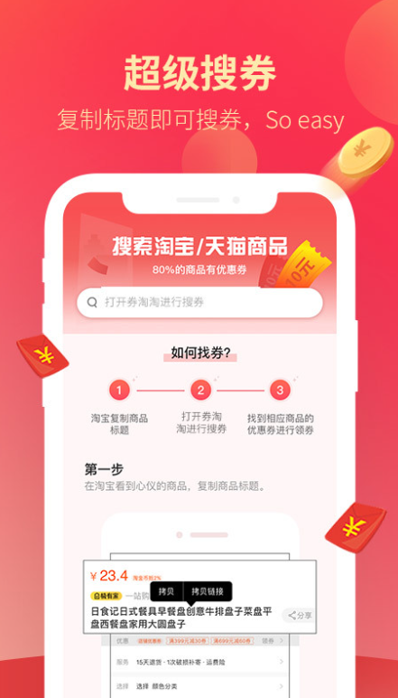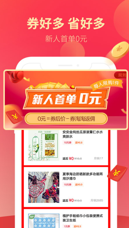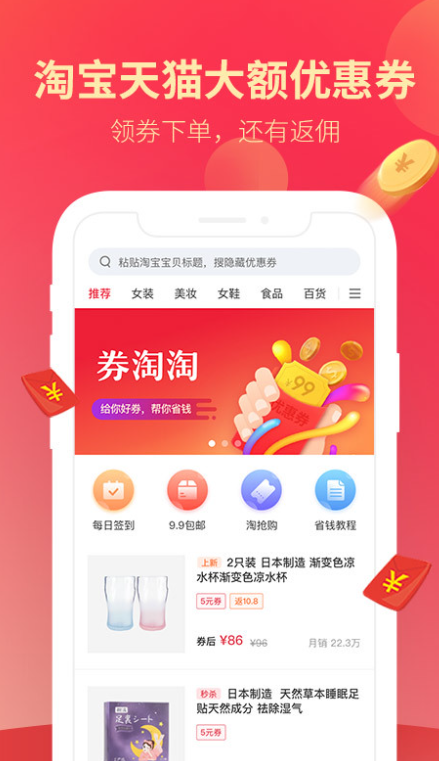 券淘淘app是一款汇集了大量免费优惠券的网络购物中心,喜欢购物的用户值得拥有,让你足不出户就可以轻松来这挑选当前比较火的商品,线上购买方便简单,购买的过程中你也可以及时领取优惠券再下单,不同的商品对应的优惠券也是不同的,用户也可以直接按照商品分类来这进行挑选,让你可以尽情低价在线交易。
