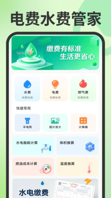 电费水费管家app是一款全方位的水电费用管理助手,不仅聚焦于水电燃等生活费用的精准查询、详细记录以及消费趋势的可视化呈现,更内置了计算器、手电筒等日常高频使用工具,甚至还贴心配备了尺子测量仪、分贝仪等特色实用功能,无论你是精打细算的家庭主妇,还是忙碌奔波的上班族,app都能成为你日常生活中的得力小助手。