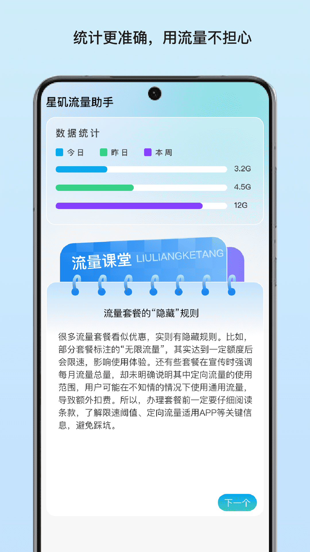 星矶流量助手app是一款流量管理领域的全能型智慧助手,它以提供流量精准换算、深度统计、时长洞察以及知识科普等核心功能为基石,为用户搭建起一座全面掌控流量使用情况的桥梁,无论是频繁使用流量的商务人士,时刻需要保持在线沟通,还是热爱追剧、游戏的年轻群体,对流量消耗格外关注,精打细算的家庭用户,app都能精准满足你对流量管理的多样化需求。