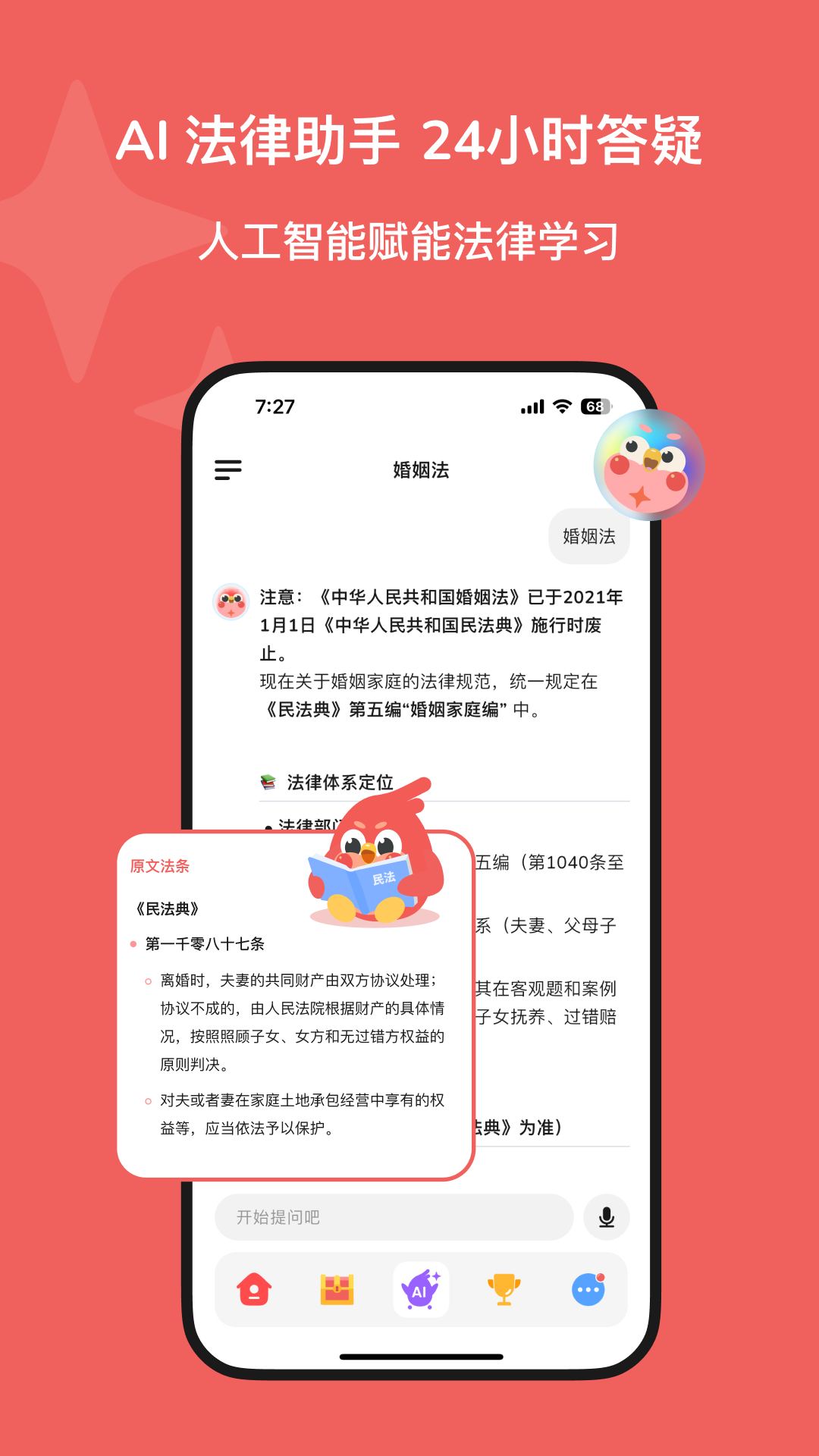 2、AI对话机器人7×24秒回咨询,用口语解释“正当防卫”,凌晨三点也能得到靠谱答案,比搜索论坛更安心。