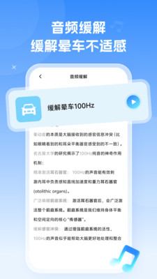 不晕车app是一款实用的防晕车小工具,为大家介绍了很多防晕车的小妙招,让坐车易晕车的用户可以缓解晕车的情况。通过视觉、声波和呼吸三种方式来帮助大家改善晕车的情况,能够随着车辆的颠簸情况智能输出音频来缓解晕车反应,还有视觉防晕车动画功能,让用户不需要通过额外的操作就能有效缓解晕车症状,并且能够学到很多防晕车的技巧。
