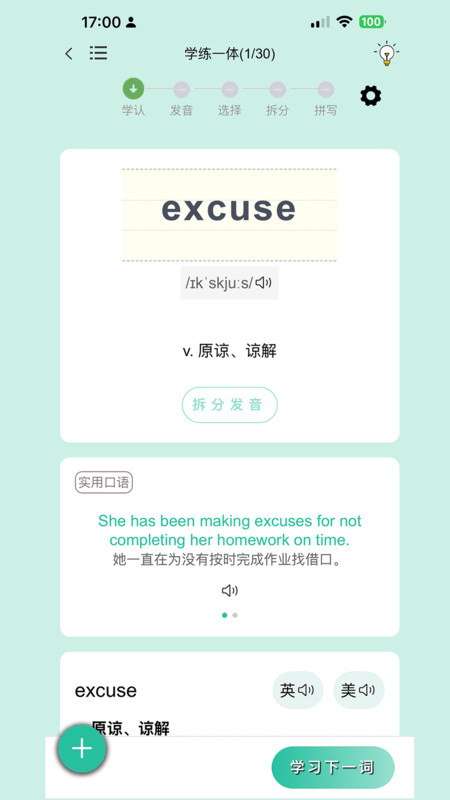 3、每个单词配备纯正发音示范,支持跟读对比与语音评测,帮助用户在记忆词义的同时提升口语准确度。