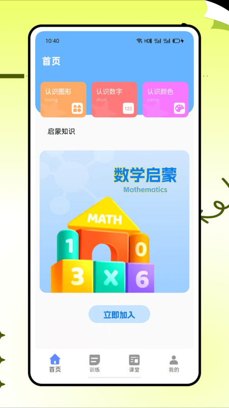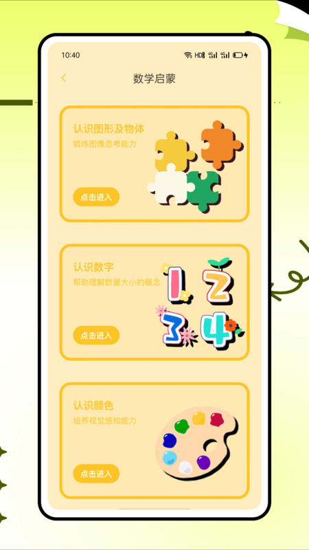 1、在首页查看,提供认识图形、数字、颜色等基础启蒙内容。