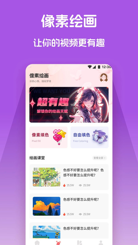 3、进入绘画页面体验像素填色、自由填色等功能,还能参与丰富绘画课堂。