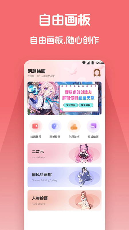1、在首页选择所需功能,如绘画教程、画板绘画、色彩技巧及模板绘画。