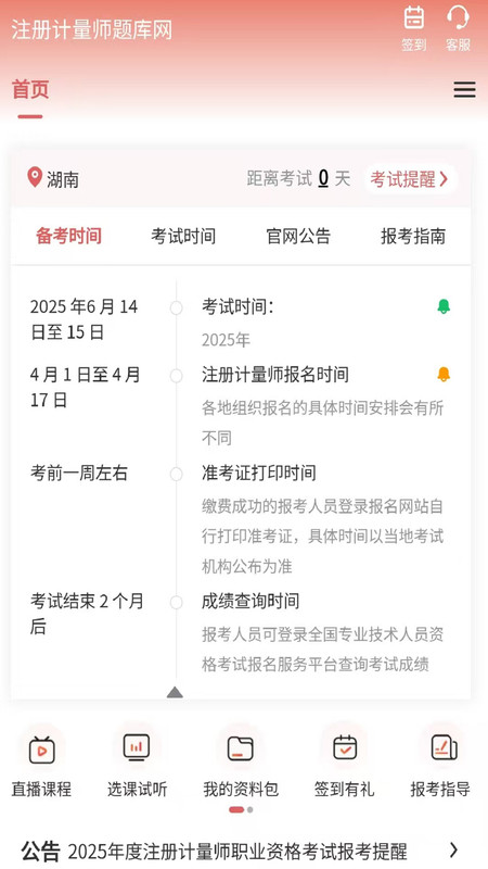 1、安装app后在首页查看,可了解备考时间、考试安排,接收直播课程。