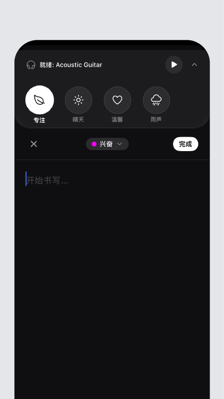 1、内置多种氛围音乐,治愈白噪音、舒缓钢琴曲随心选,伴着旋律书写,情绪记录更具沉浸感。