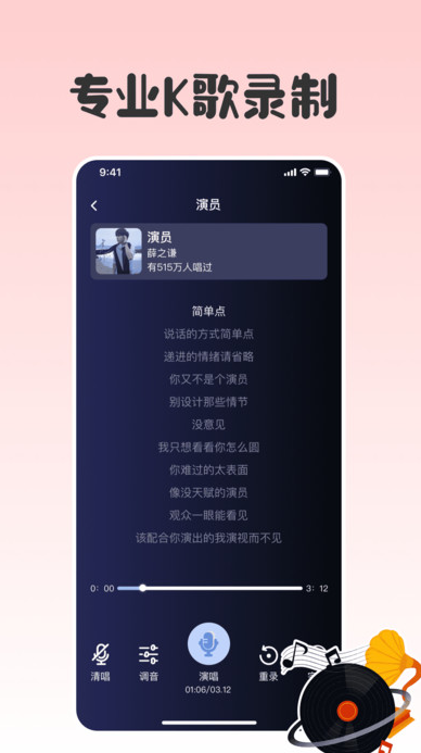 1、内置专业录音功能,采用高保真音频采集技术,完整捕捉用户歌声细节,还原真实音质。