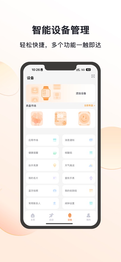 1、与兼容的智能手表/手环深度绑定,实现数据同步、功能设置与固件管理。