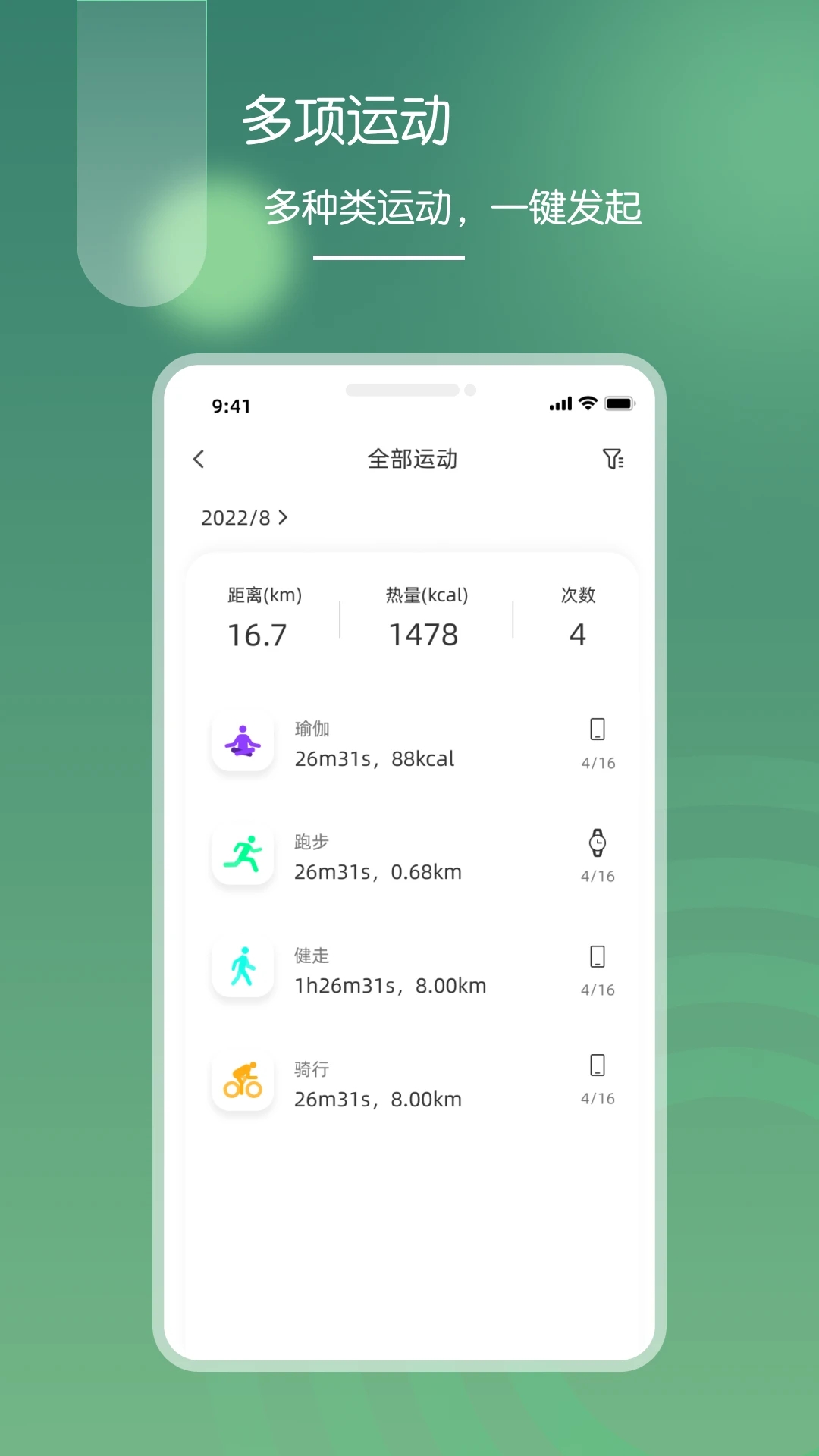2、建立专属个人健康档案以持续记录与分析健康数据,同时集成多种运动模式与详细的数据可视化追踪。