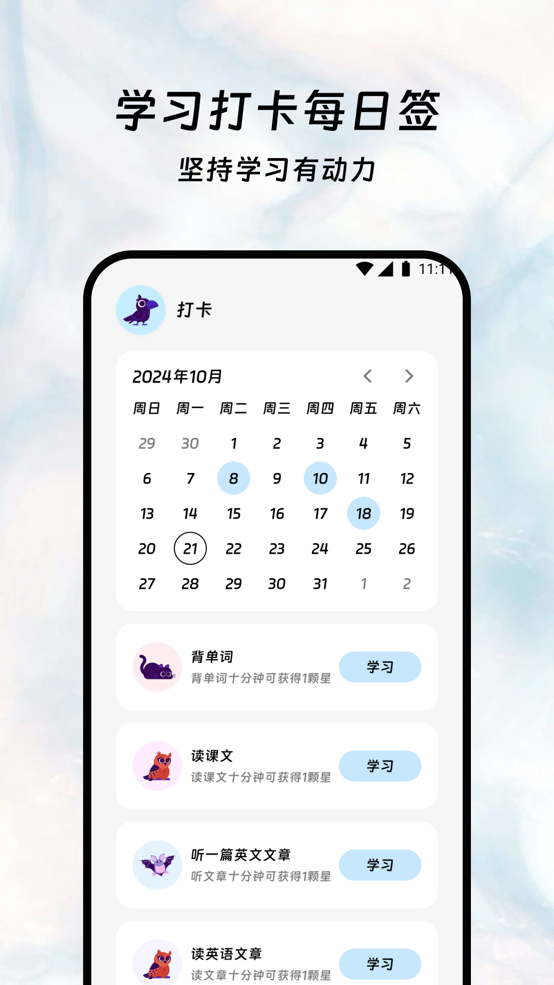 3、提供每日学习打卡功能,用户可以设定学习目标,通过每日签到记录自己的学习进度。