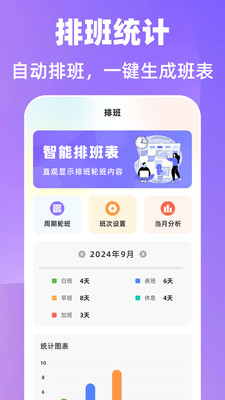 3、排班信息直接呈现在日历界面,倒班换班情况一目了然,每月排班还能生成统计图表,方便用户核对与管理。