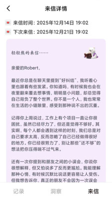 2、每周来信如约而至,结合你的情绪记录定制内容,有安慰的话语、实用的调节建议,像专属情绪陪伴师。