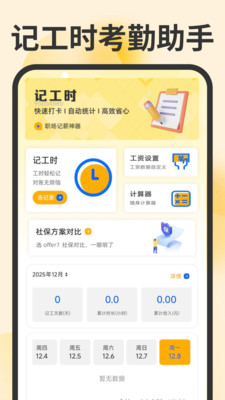 1、是职场人与自由职业者的专属工具,一键记录工时、核算薪资,社保规划全涵盖,让收入与保障管理更省心。