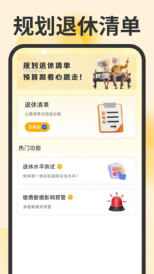 3、退休清单规划提前布局,按缴费基数与年限智能测算养老金,生成个性化规划方案,养老保障早知道早准备。