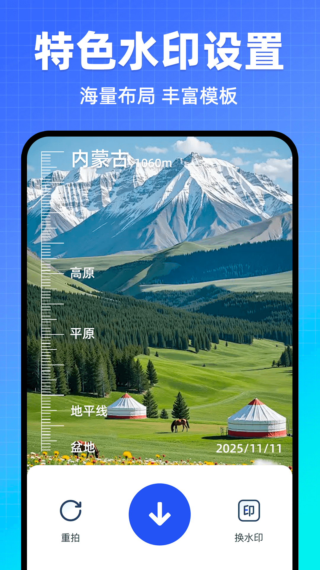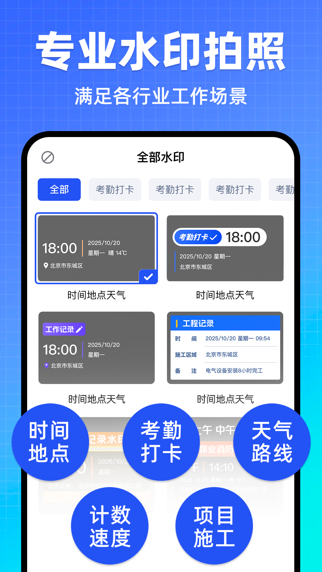 1、 在拍摄界面即可直接选择并添加各类水印模板,实现拍照与标记同步完成。