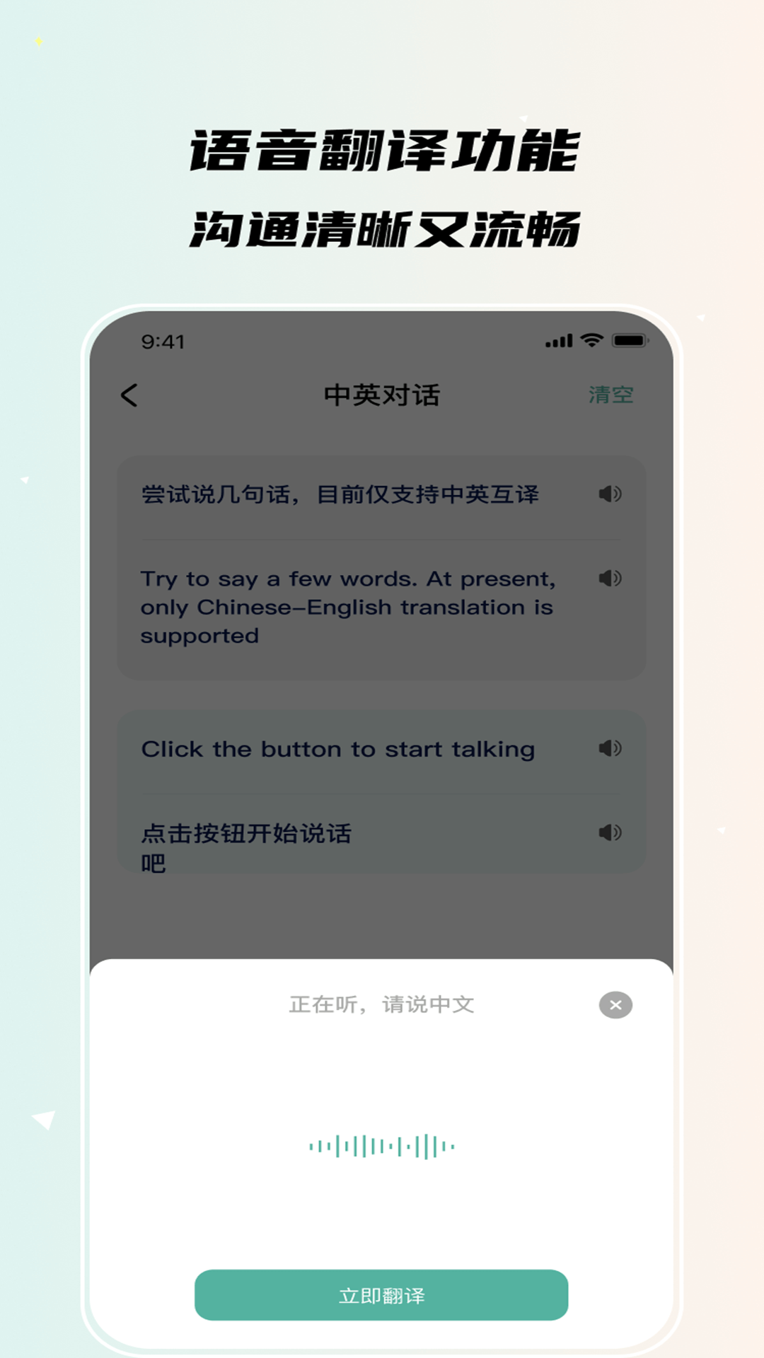 2、语音翻译,实时流畅,支持双向语音翻译,沟通无障碍,让国际交流更加顺畅无阻。