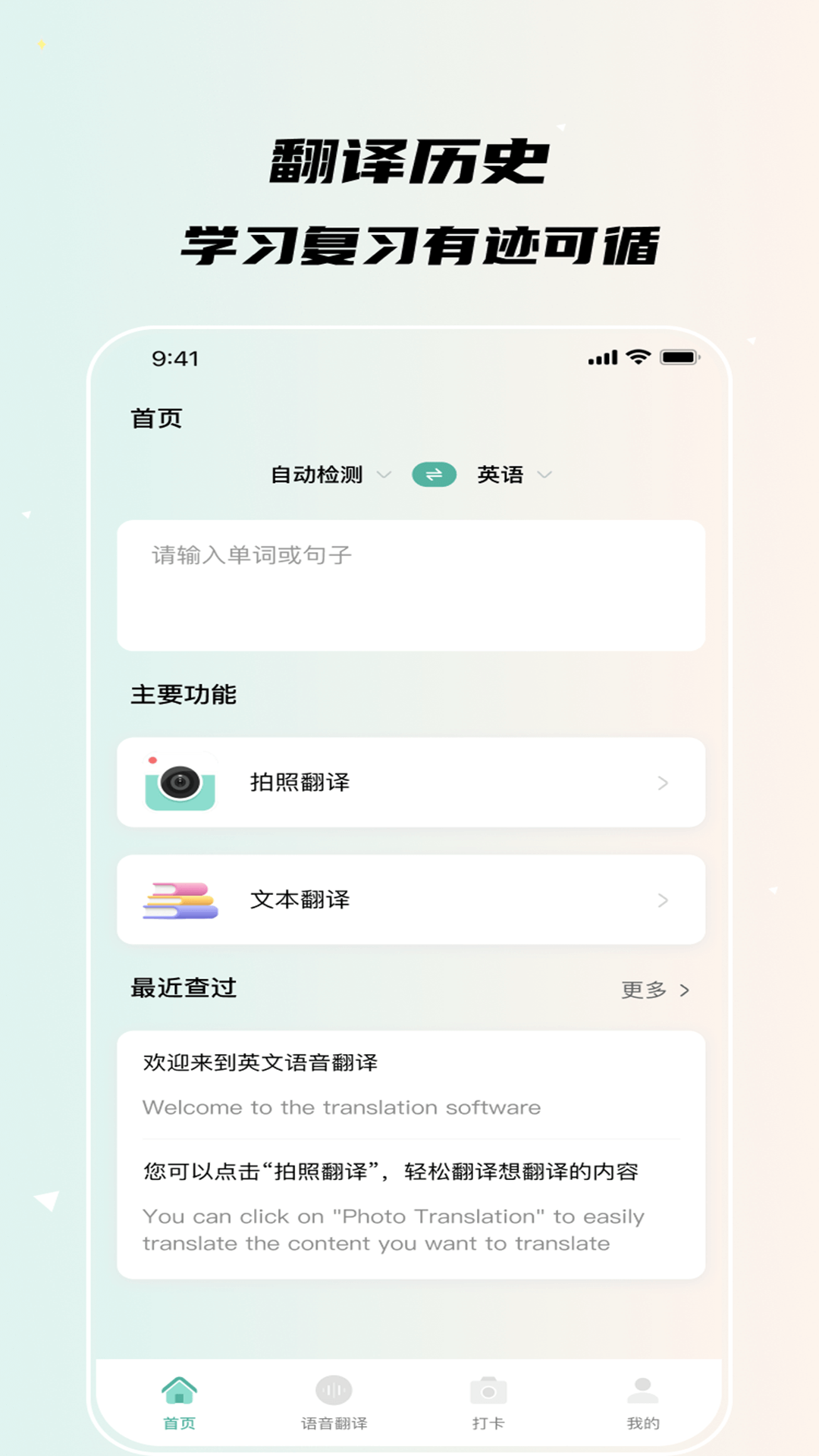 浮溪翻译宝app是一款贴心实用的外语翻译小能手,如随身携带的跨语言沟通桥梁,集拍照翻译、语音翻译、翻译历史追溯与打卡学习激励于一身,为用户开启一场既高效又充满成就感的语言探索之旅,能够在这款应用中找到满足需求的翻译与学习解决方案,让每一次语言交流都成为展现自我、增进理解的精彩瞬间。