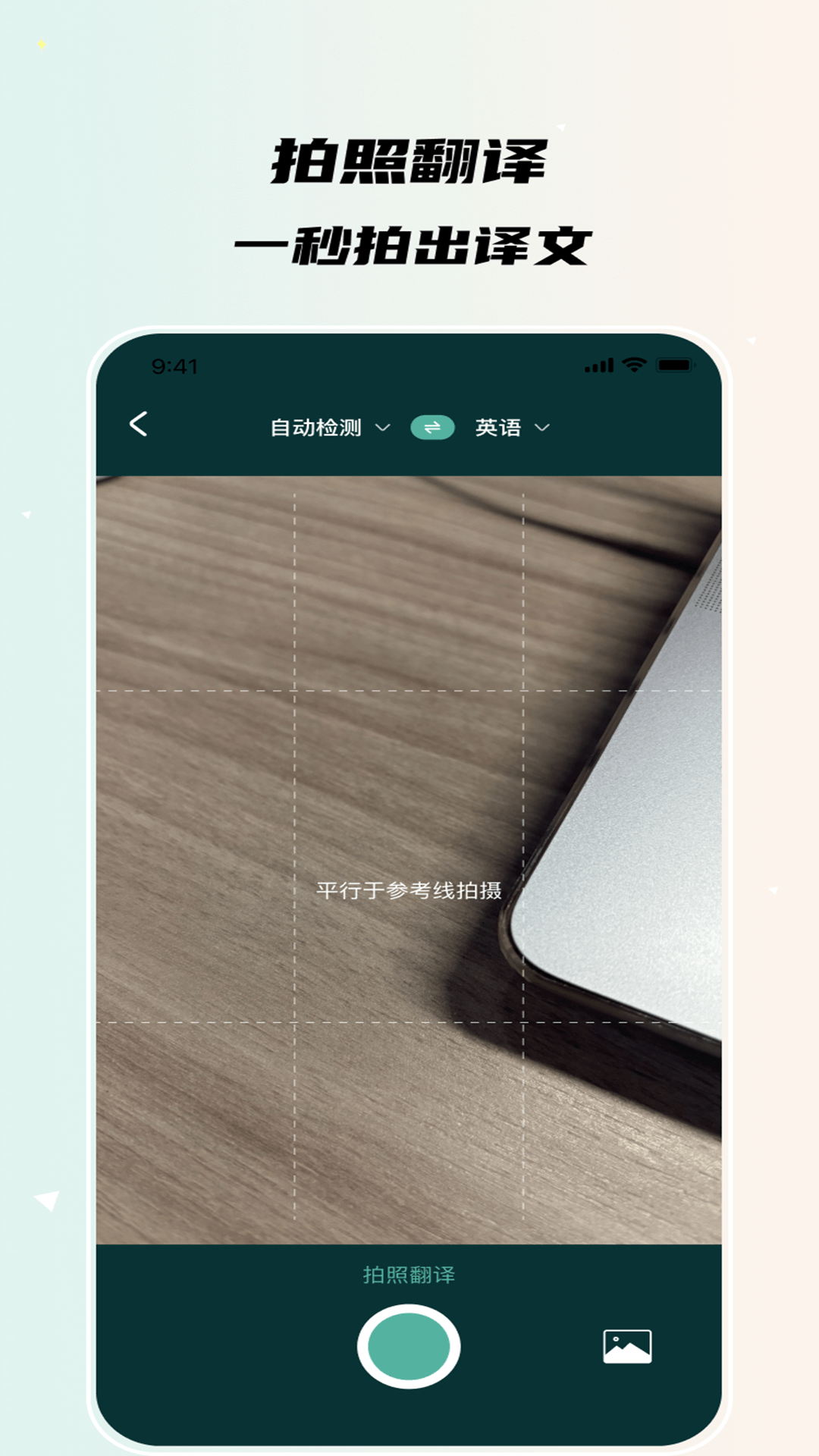 3、对准需要翻译的文字,无论是路标、菜单还是文件,一拍即得准确译文,轻松跨越语言障碍。