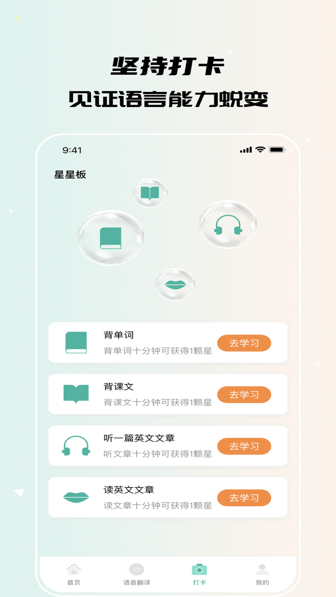 3、操作便捷流畅,更有贴心打卡功能,激励用户坚持学习,见证语言能力的蜕变。
