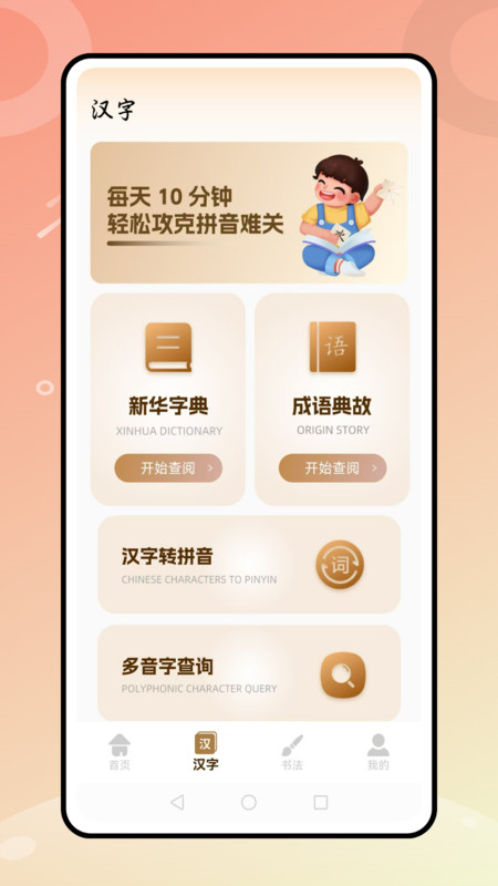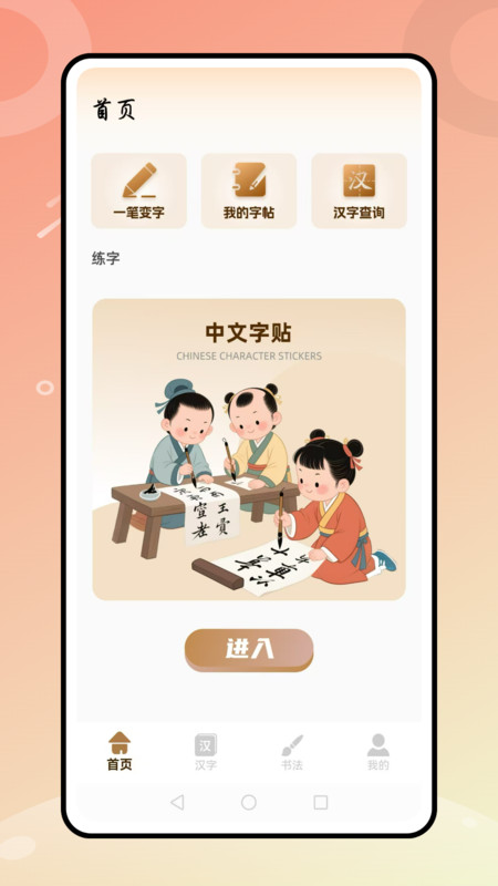 1、安装并进入App首页,可使用一笔变字、汉字查询及练字服务。