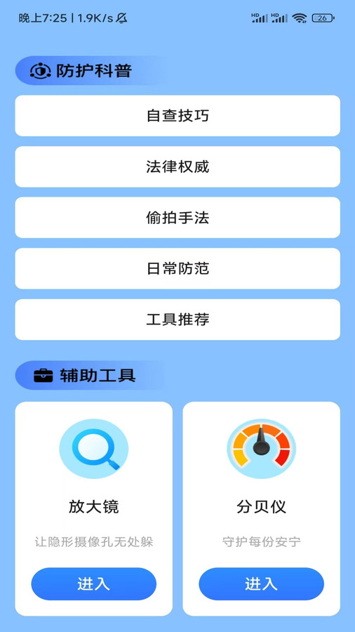 4、提供防偷拍知识科普,并可能集成摄像头/红外检测等简易工具,提升用户的环境安全意识。