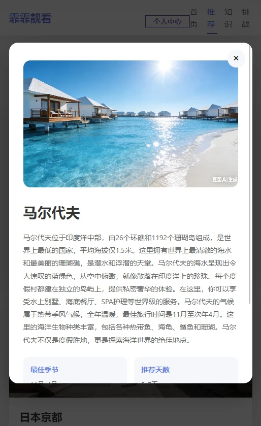 3、提供了丰富的精选目的地推荐,涵盖全球热门和小众景点,如马尔代夫、日本京都等。