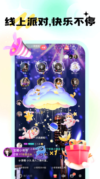 4、提供多种轻量互动玩法,如语音派对、助力破冰,轻松开启互动聊天。