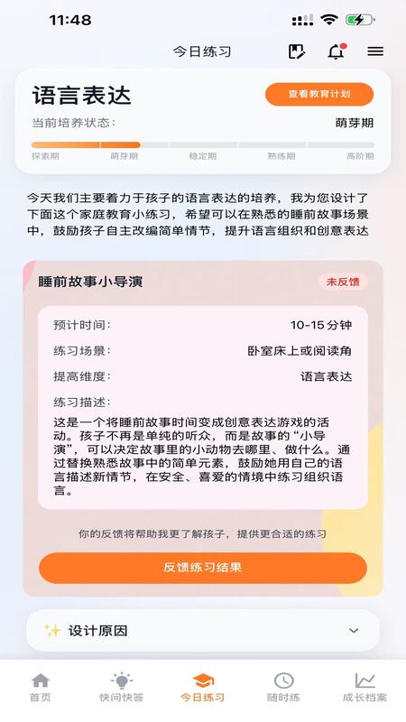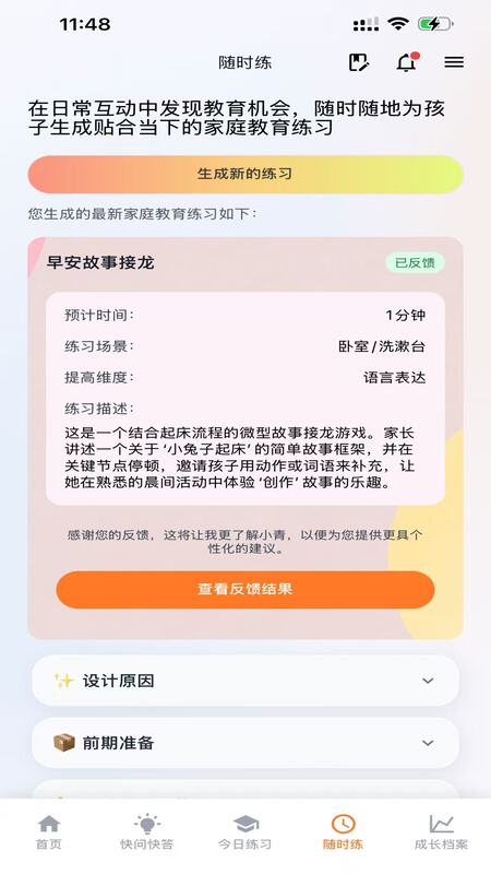 2、能够根据孩子的年龄与当前表现,智能生成并推荐个性化的亲子游戏与日常练习内容。