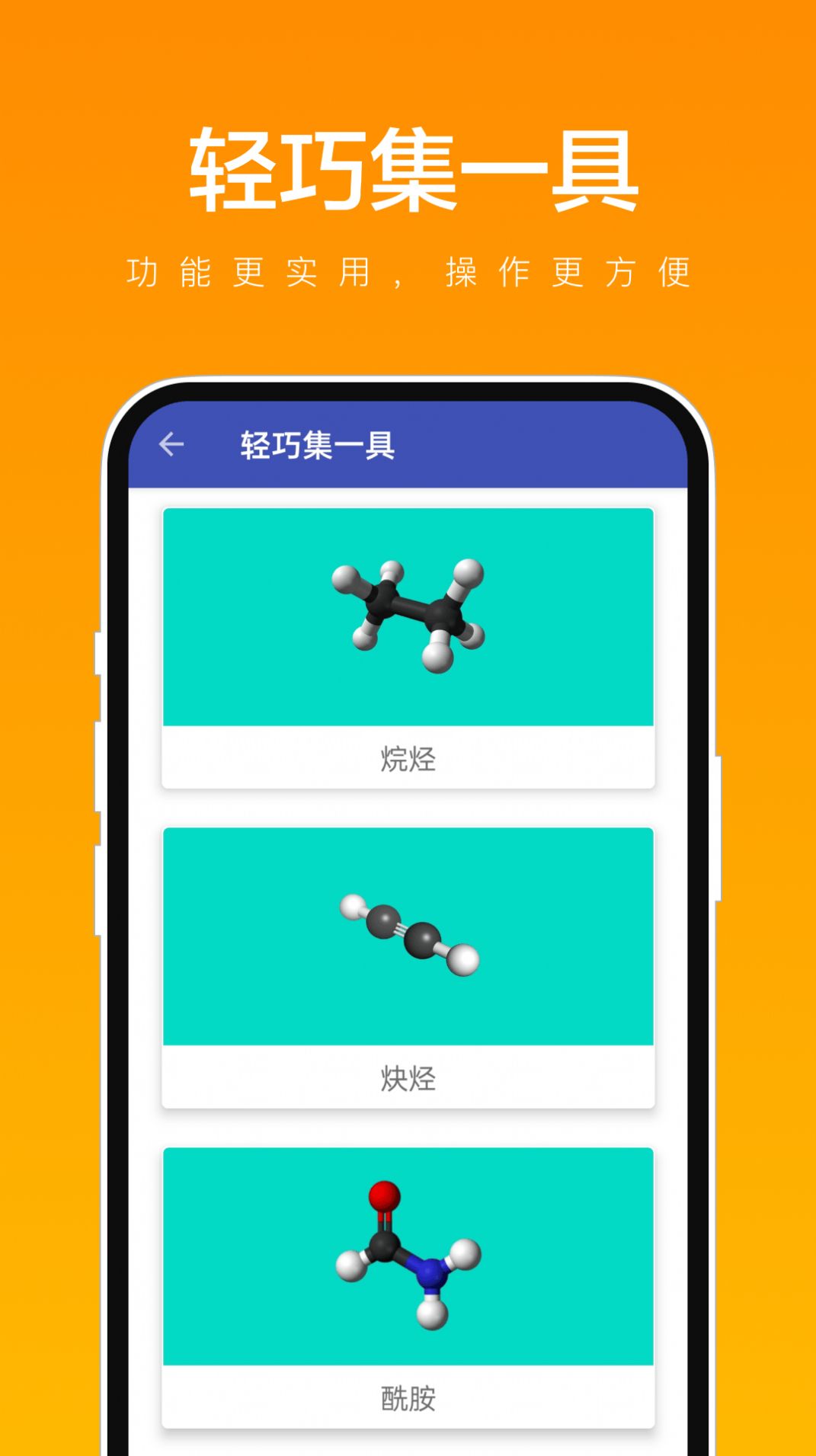 2、来到软件首页,可使用化学方程式、转换器、年龄、折扣、科学计算器等功能。