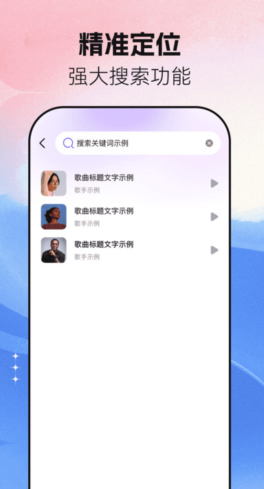 1、支持关键词精准搜索,用户可输入歌曲名称、歌手名称等相关信息,快速匹配对应的音乐资源。