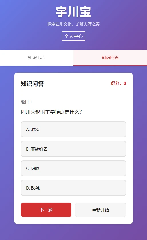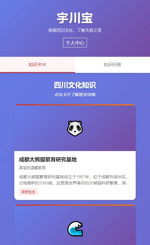 2、通过知识卡片和趣味问答的形式,APP让用户在轻松愉快的氛围中学习四川文化知识。