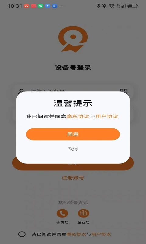 1、下载瑞犇物联app安装好打开它,看到温馨提示的弹窗直接点同意。