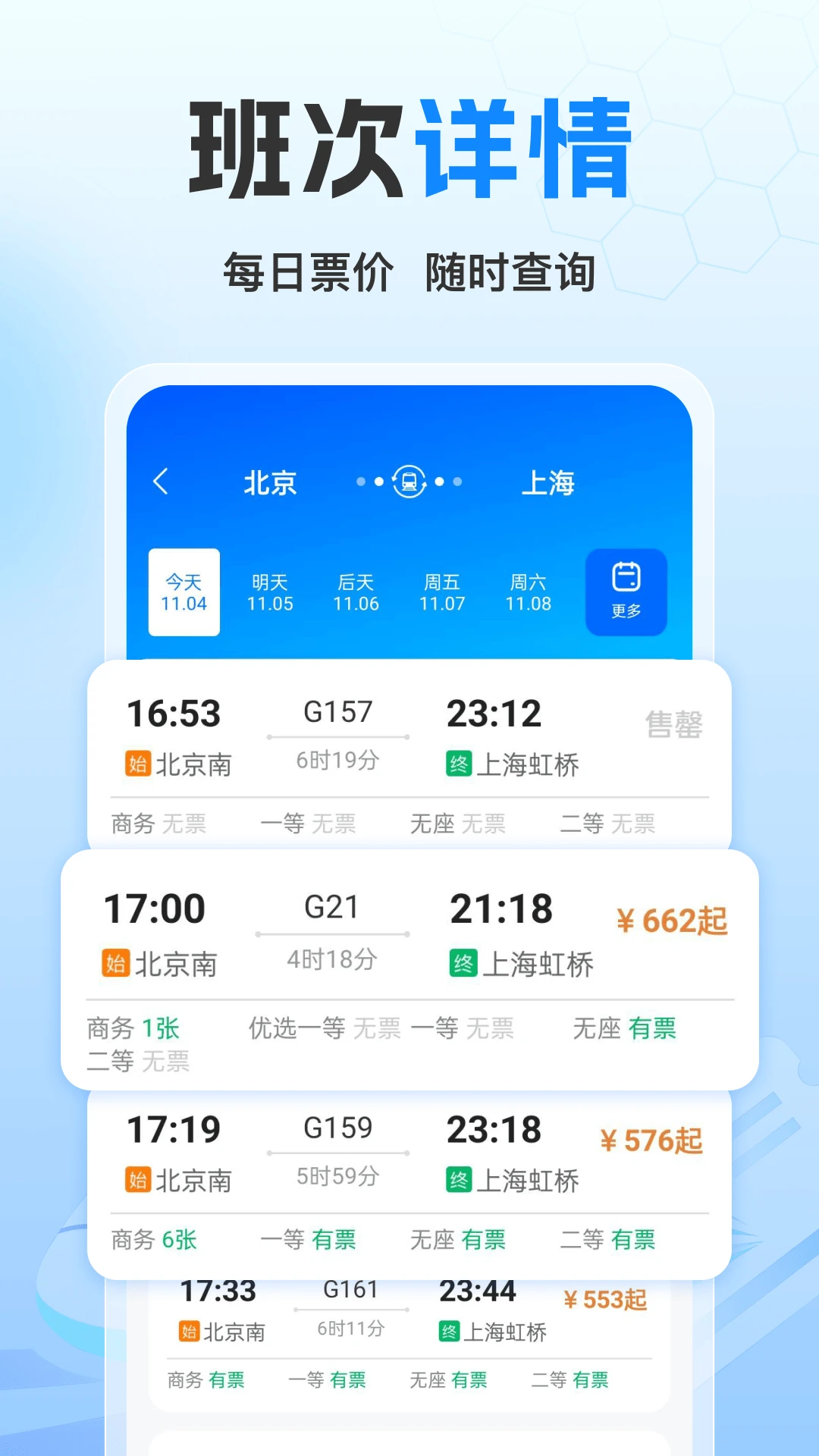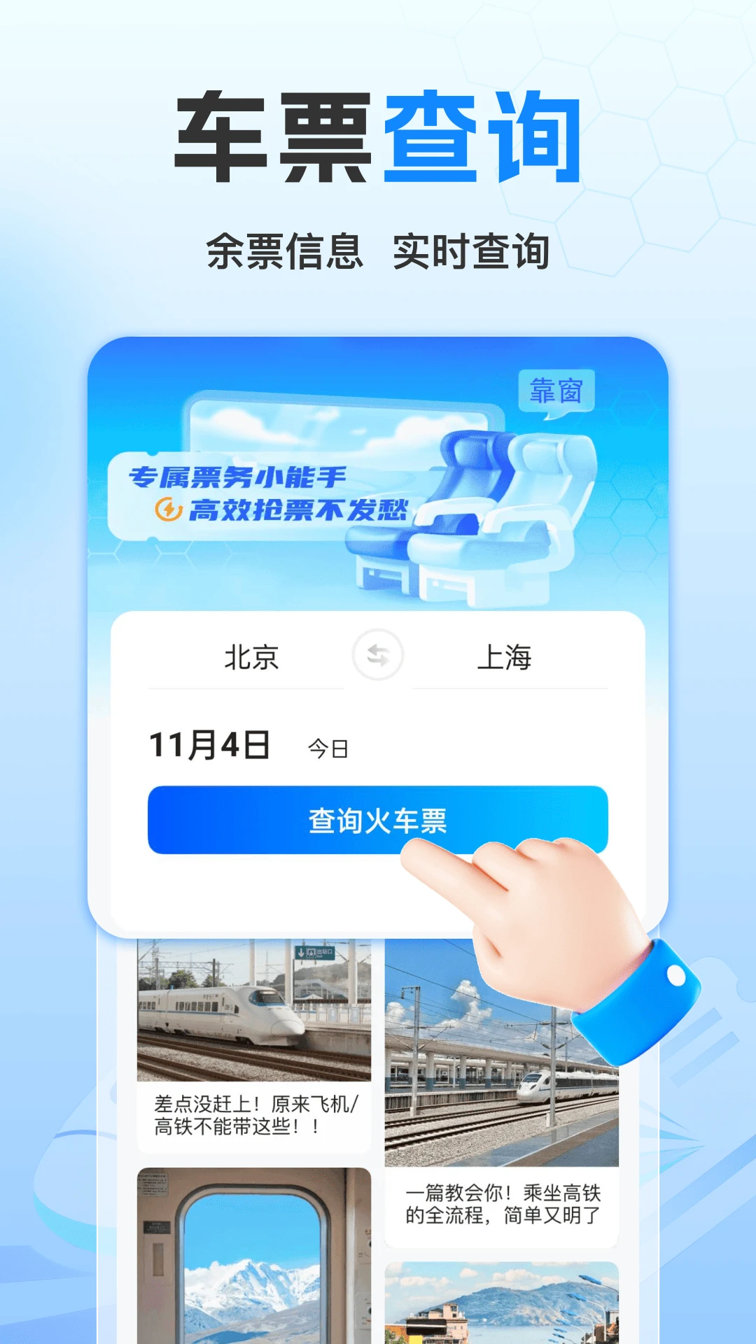 1、实时同步 12306 官方票价数据库,输入出发到达城市即刻呈现最低折扣车次,同步速度低于三分钟,确保所见价格即为最终支付价。