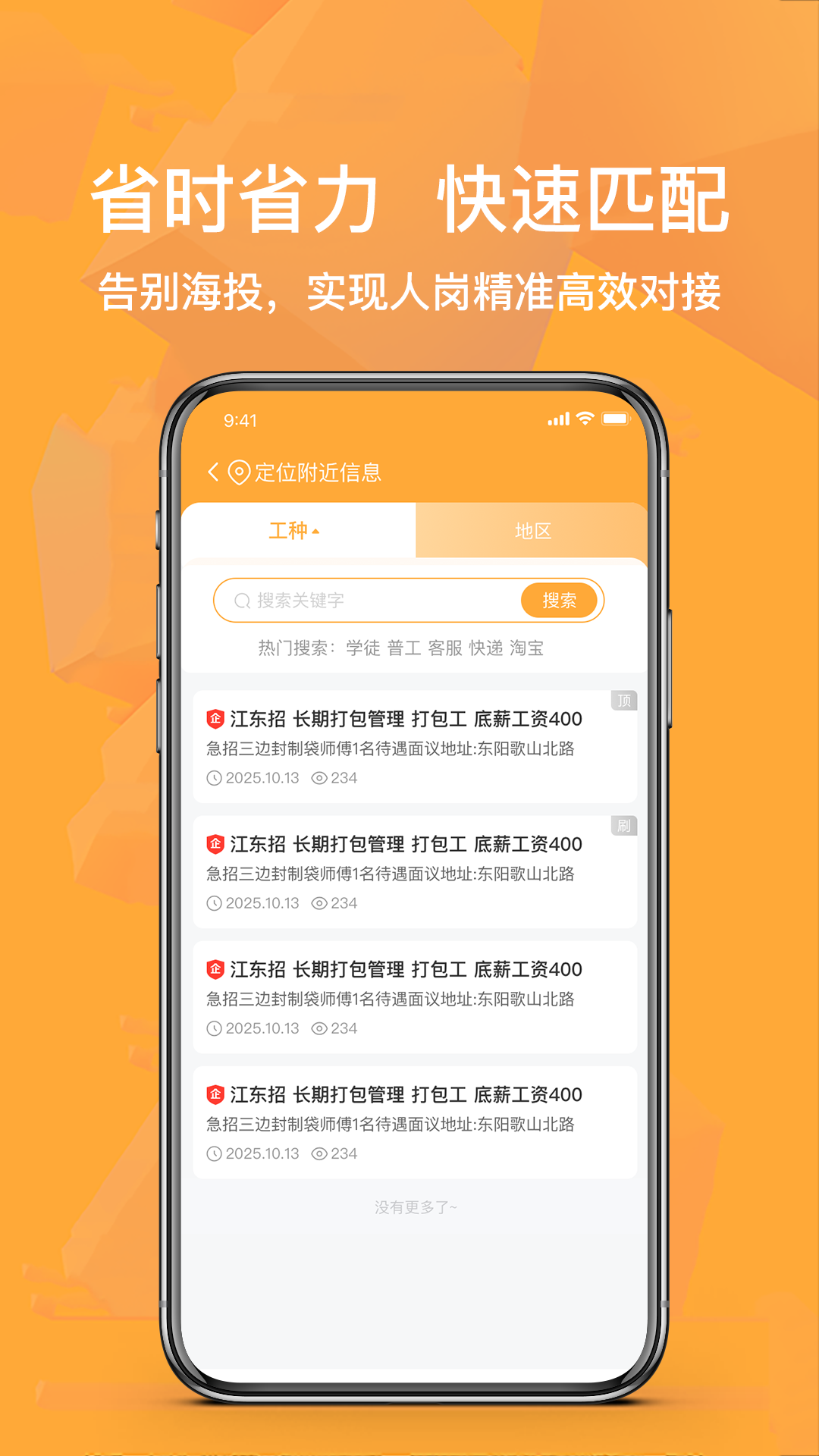 2、APP支持用户创建个性化求职档案,设置薪资期望、工作地点、岗位类型等筛选条件,app自动匹配符合需求的岗位并推送提醒,帮助用户快速锁定适配机会,减少无效浏览。