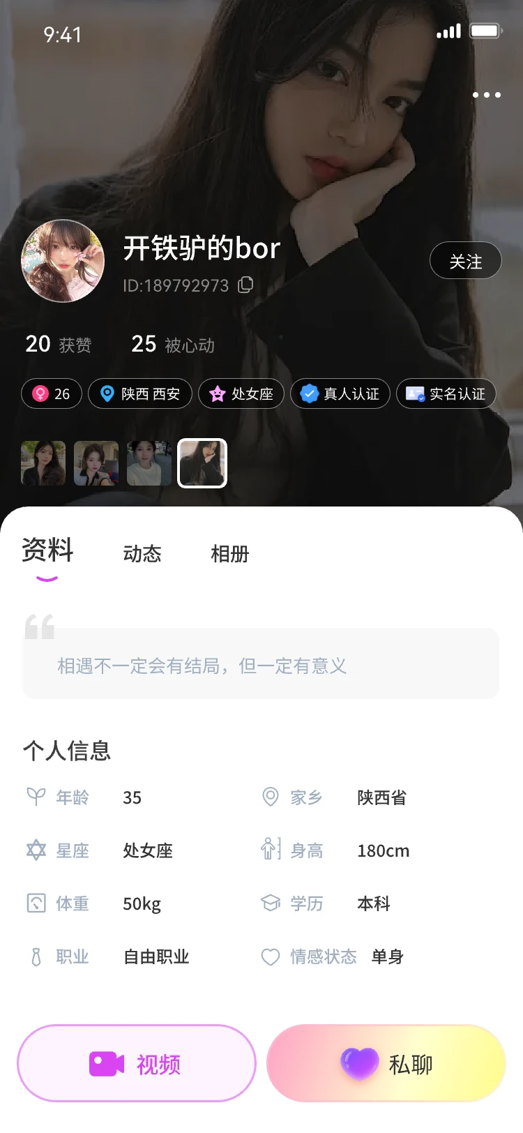 4、选择你感兴趣的异性,点击头像就能查看对方的个人信息,对她有个基本的了解,还能点击视频或者私聊哦。