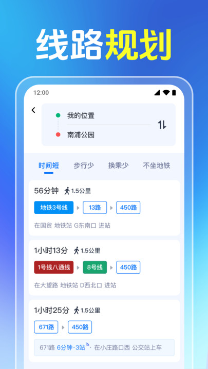 3、输入起点和终点后,系统会给出时间优先、步行最少、换乘最少三种方案,并用不同颜色在地图上画出全程轨迹,方便你按场景挑选最优路线。