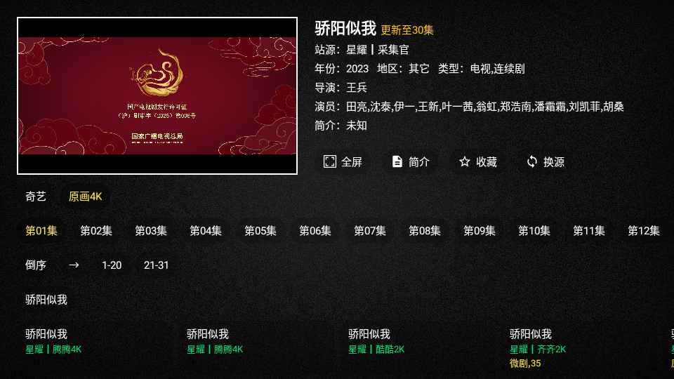 3、在影视播放过程中,支持选集播放、收藏、换源等操作。