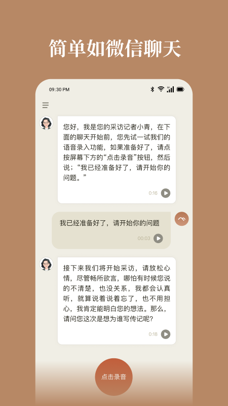 4、采用自然、轻松的问答聊天模式,将复杂的传记写作过程转化为一次次的对话回忆之旅。