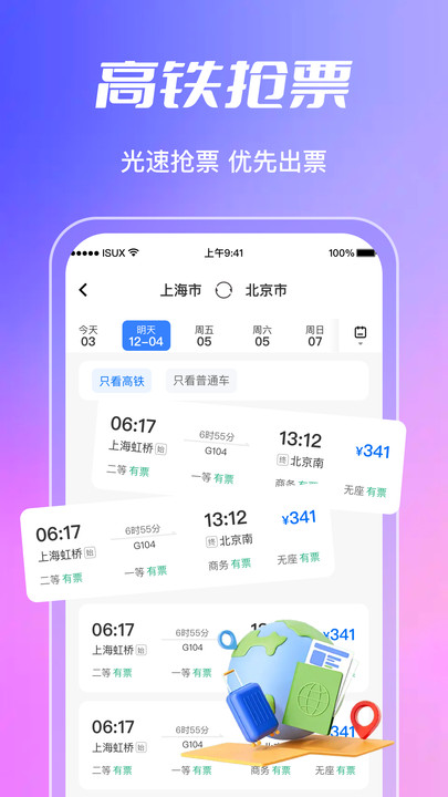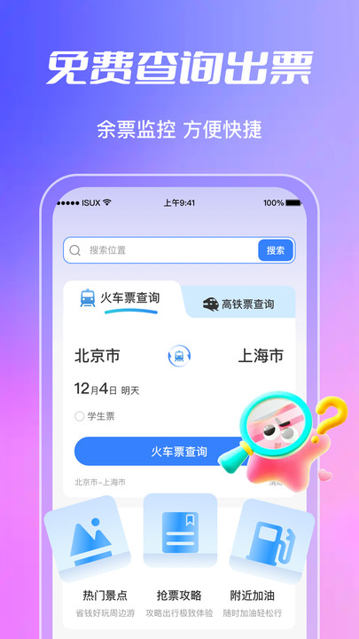 铁路火车票候补买app下载是一款集火车票查询、候补购票、智能出行规划与实用攻略于一体的综合性铁路出行助手APP。它不仅能为您提供火车高铁票的实时余票查询与官方候补购票服务,还深度整合了出行相关的多元功能。APP会根据您的行程,智能推荐高铁沿线的热门景点,并提供节省成本的出行方案,例如通过拆分行程或选择冷门车次来规划低价路线。