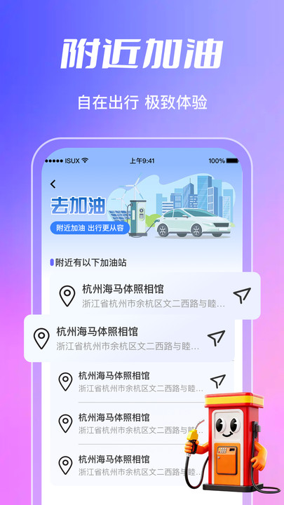 4、集成基于地理的周边加油站查询功能,显示位置、油价、营业时间,满足自驾接驳的应急需求。