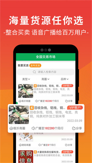 3)优质货源:推送附近寻货消息,商家在线撮商,买货卖货高效更快捷