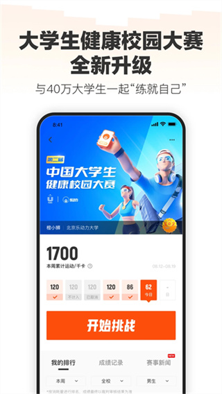 Al智能科技,科学锻炼,记录运动数据,全国高校联动,打卡健身计时赛,在家也能随时pk,无时无刻燃烧竟技之魂,体验云上比赛的快感。