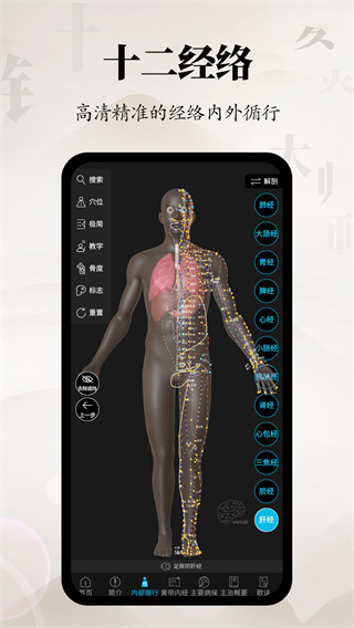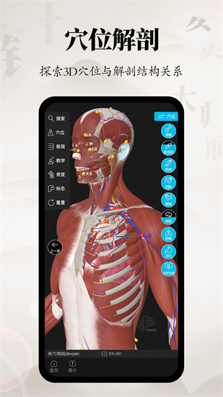 打开APP,在首页打开3D模型,选择十二经脉或奇经八脉即可查看经络内外循行路线,点击穴位可以查看详细信息。点击解剖模式切换按钮可以查看穴位周围的肌肉、血管、神经等结构,还可以360°旋转观察针刺层次。