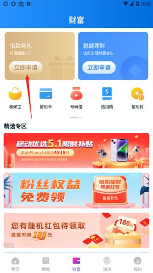 想要借款?操作简单得让人惊喜!进入财富页面后,你会看到借款有礼模块,点击立即申请就能开始你的借款之旅!