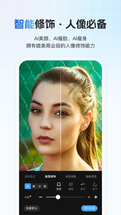 它可以自动识别照片中的人脸,进行磨皮、美白、瘦脸、甚至是全身美型等一系列操作,效果自然又高级,处理效果完全不输给商业级的精修大片。